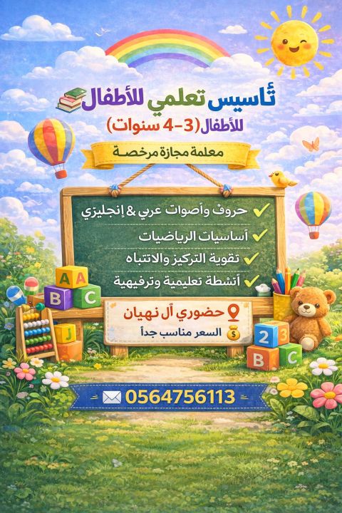 تأسيس تعليمي للاطفال (3 - 4 سنوات) معلمة مجازة مرخصة أقدم برنامج تأسيس ممتع وآمن يشمل حروف وأصوات عربي & انجليزي أساسيات الرياضيات تقوية التركيز والانتباه أنشطة تعليمية وترفيهية حضوري آل نهيان السعر مناسب جدا للتواصل