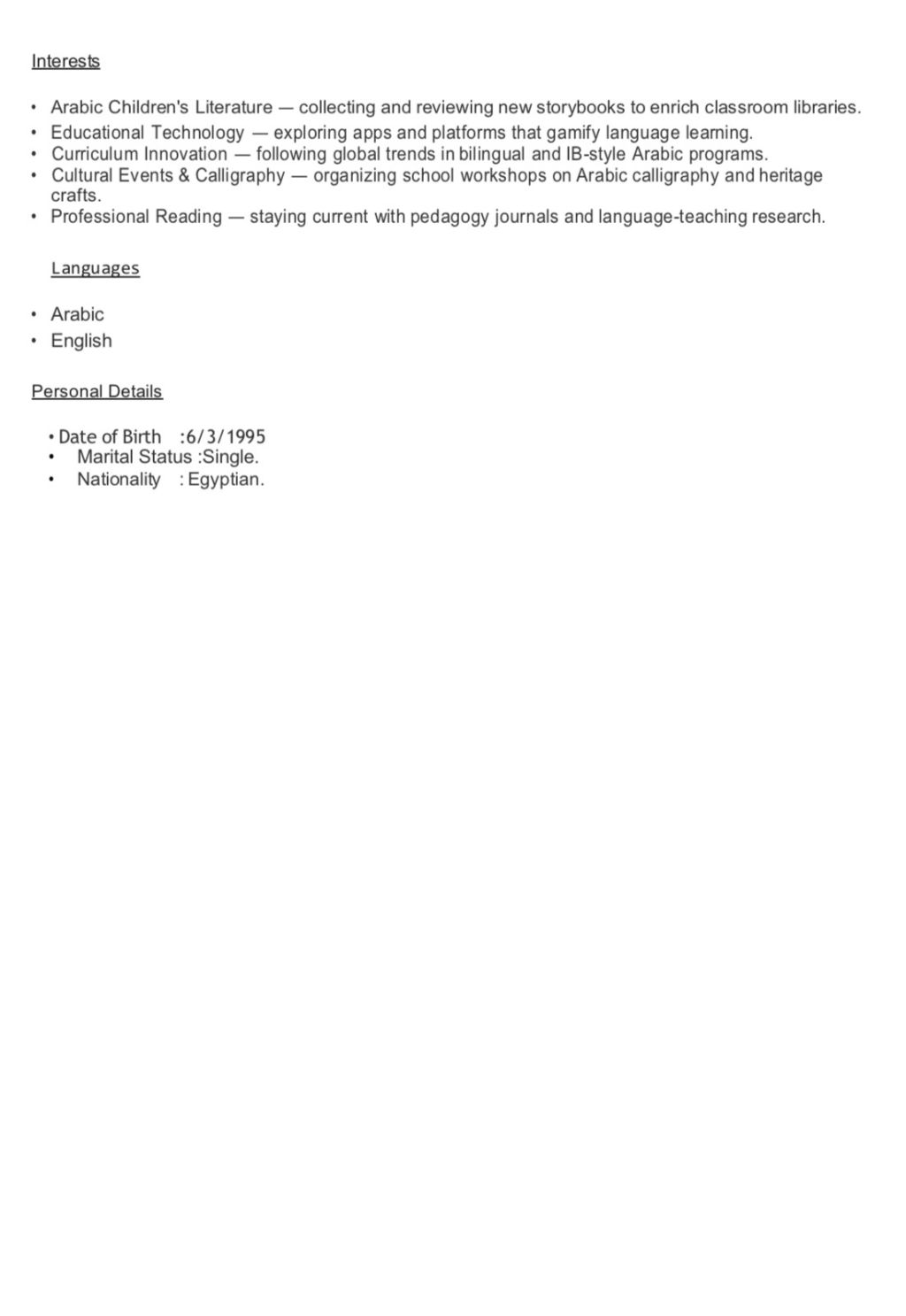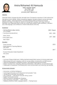 My name is Amira Mohamed, an Arabic teacher with a Bachelor’s in Education and a Professional Diploma. I have over 8 years of experience in national and international schools. Skilled in lesson delivery, classroom management, planning, and using technology. Currently seeking a teaching job in the UAE