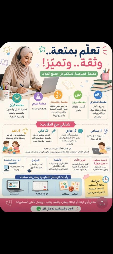معلمه جميع المواد وتأسيس لغة انجليزيه خبرة بالتدريس داخل الدولة منهج بريطاني وأمريكي والحكومة والشراكة المتابعة المستمرة وحل الواجبات المدرسية بأسعار مناسبة واتساب للتواصل