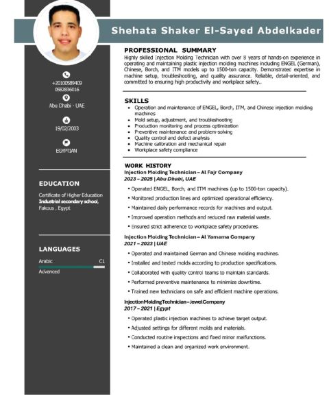 أنا معيا خبرة أكثر من 6 سنوات في مجال الحقن البلاسيتك فني تشغيل ماكينات وتغيير اسطنبات ويوجد تعامل مع أعطال بالميكانيكا والكهرباء
