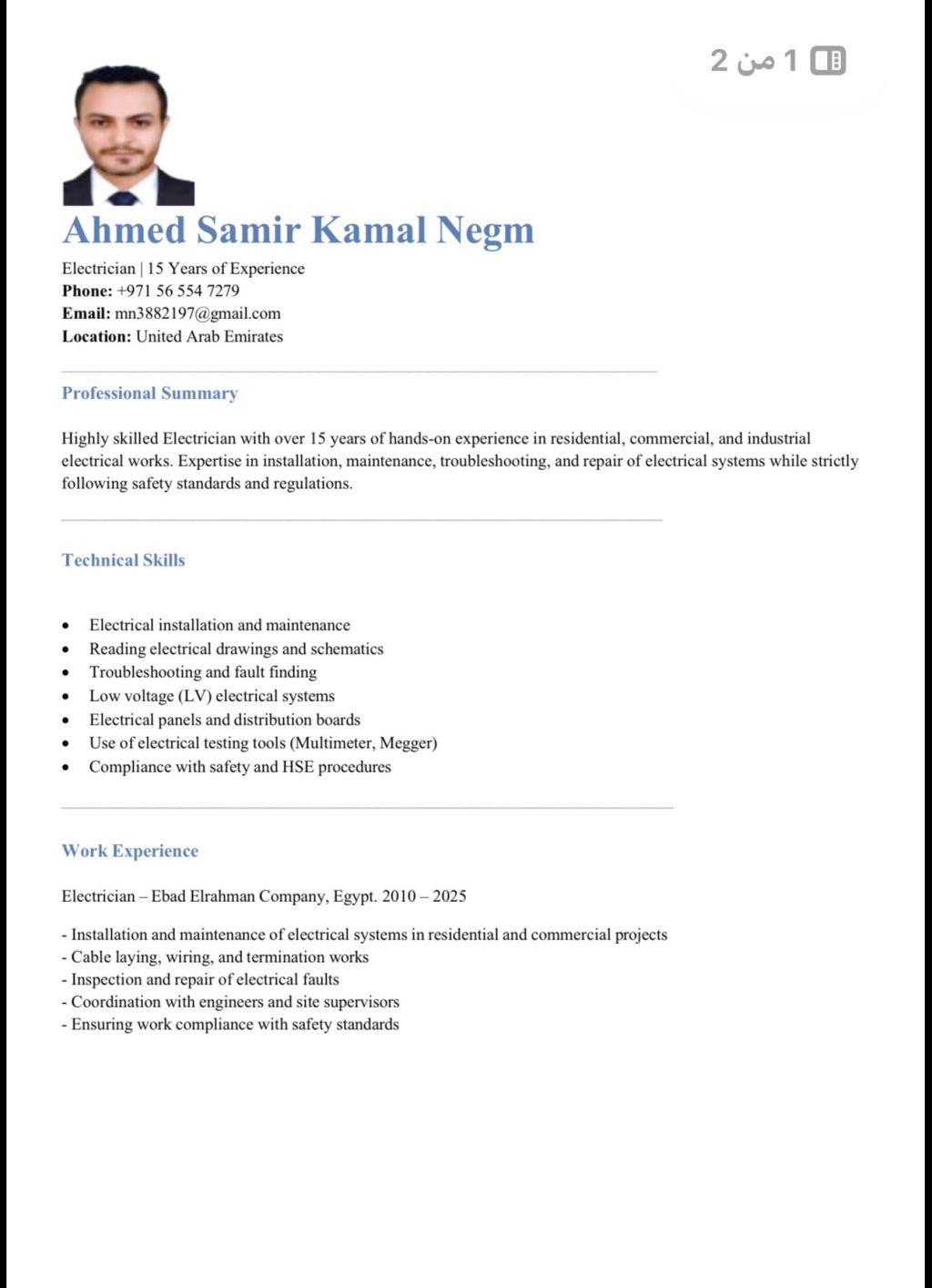 ابحث عن وظيفة شاغرة في مجال الكهرباء. امتلك خبرة جيدة في أعمال التركيب والصيانة الكهربائية، وتشخيص الأعطال واكتشافها ومعالجتها. أجيد قراءة وتخطيط المخططات الكهربائية، وتنفيذ تمديد الكابلات والتوصيلات الكهربائية بشكل كامل وفق تعليمات المهندسين. لدي خبرة في تركيب وصيانة الأنظمة الكهربائية للمشاريع السكنية والتجارية، مع الالتزام بمعايير السلامة والجودة في العمل
