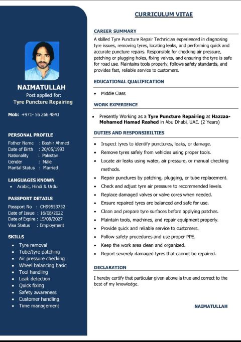 A skilled Tyre Puncture Repair Technician experienced in diagnosing Tyre issues, removing tyres, locating leaks, and performing quick and accurate puncture repairs. Responsible for checking air pressure, patching or plugging holes, fixing valves, and ensuring the Tyre is safe for road use. Maintains tools properly, follows safety standards, and provides fast, reliable service to customer