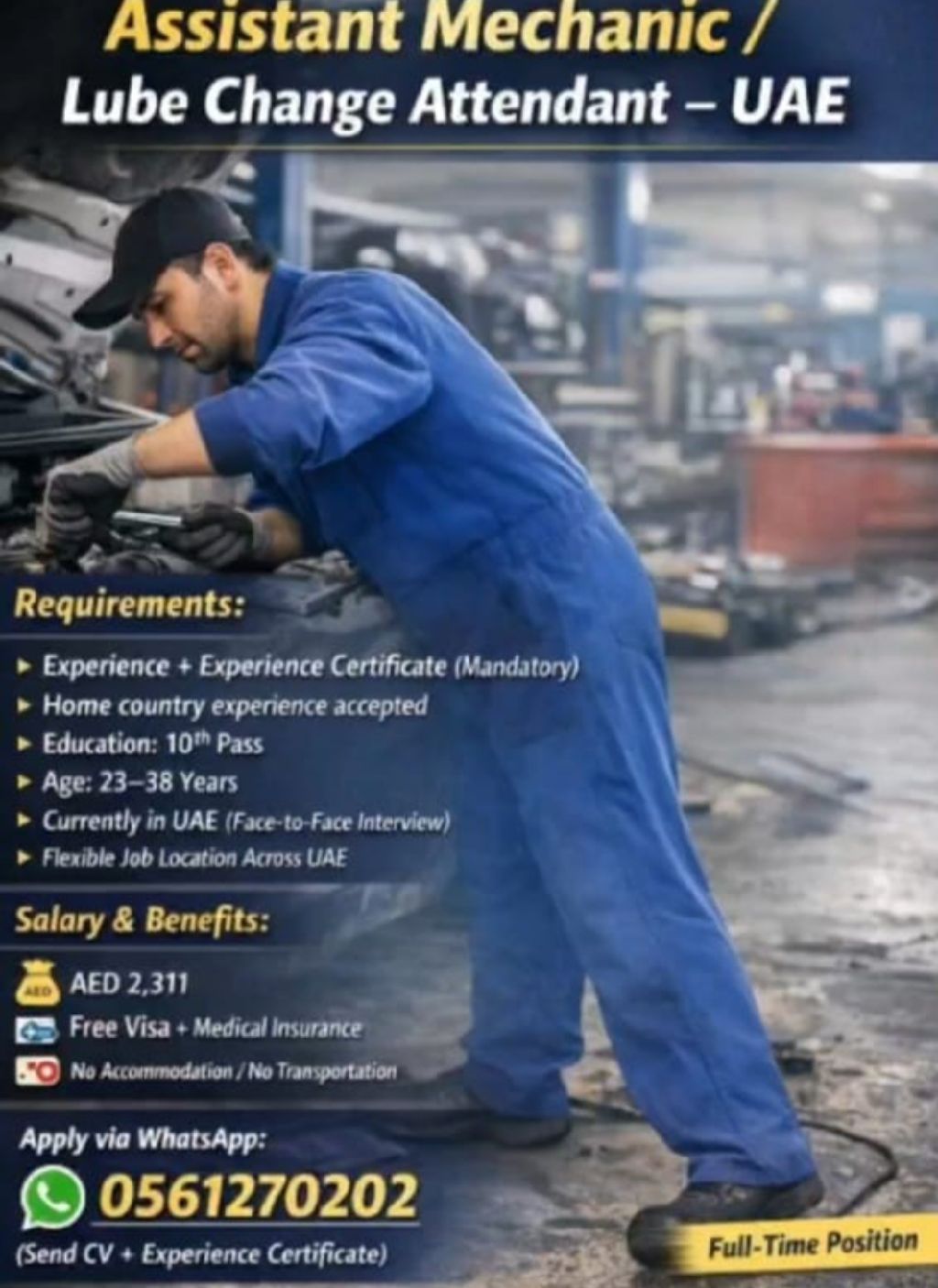 Assistant Mechanic - change oil cars (experience mandatory + experience certificate) Education Matric (certificate mandatory) age 22 - 38. Salary 2311 + free visa + medical insurance Job location all over UAE Abu Dhabi Mussafah - Dubai Share CV to