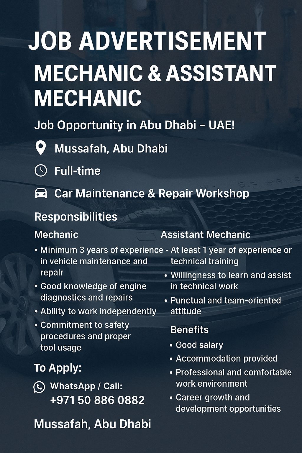 مطلوب ميكانيكي خبرة لشركة تصليح سيارات في منطقة المصفح في أبوظبي يرجى التواصل على الرقم الموجود أو الايميل