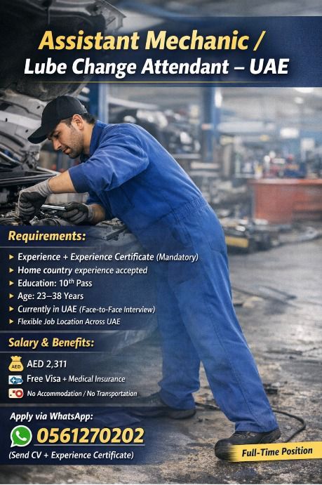 Assistant Mechanic - Experience + certificate Mandatory. Offer AED2311 + Visa + Medical insurance. Job location can be anywhere in UAE. Share CV + experience certificate to. Job location Abu Dhabi - Dubai - Sharjah. for face to face interview