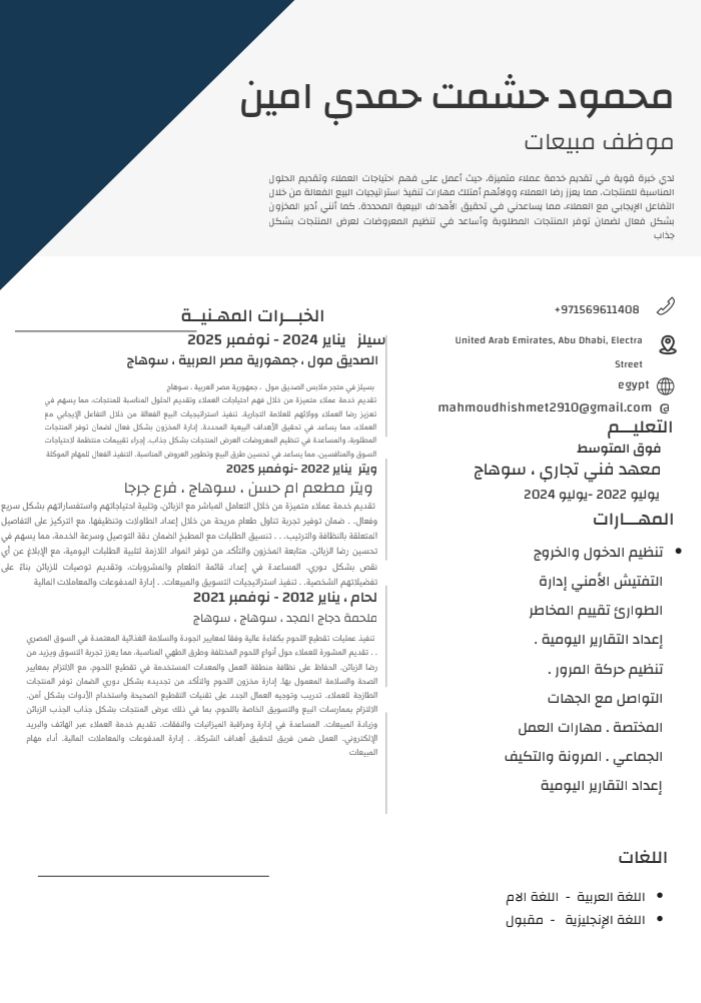 أنا محمود من مصر عندي 24 سنة ولدي اقامة قابلة للاعارة ولدي خبرة في وظيفة وايتر والسيلز ومساعد مطبخ وخبرة كبيرة في مجزر دواجن كما عملت في هذا الوظائف مصر ولدي الخبرة في هذه المجالات منها