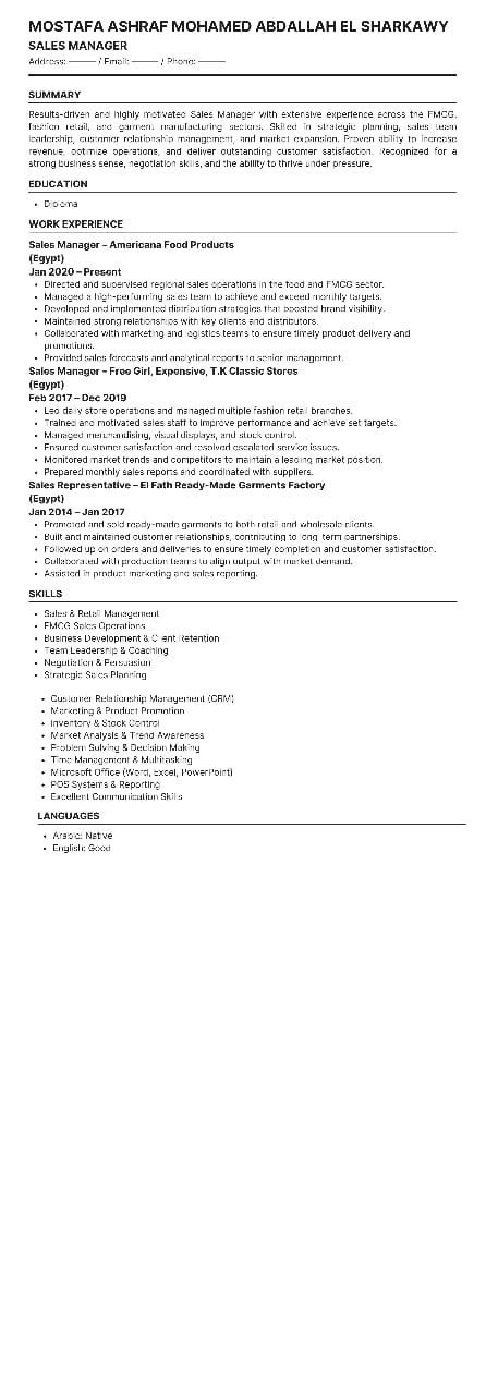 I am Mostafa 32 years old, university graduate, residing in the UAE. Freelance contract effective today. Two - year freelance residency. Fluent in English (100%) Excellent character. Proficient in all aspects of sales. 15 years of sales experience. Experienced in tourism and dealing with all segments of society. CV available. Ready to work in all sales specialties, whether tourism or clothing