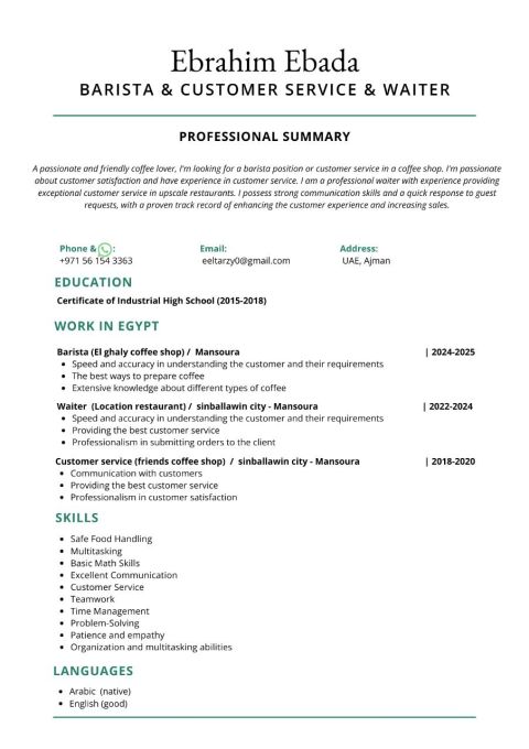 الاسم عبدالإله الوظيفة وايتر / موظف خدمة عملاء الخبرة 7 سنوات خبرة في الإماراتجهة البحث فرصة عمل جديدة في مجال المطاعم والضيافة نبذة عني وايتر محترف ذو خبرة عملية قوية في مجال الضيافة داخل الامارات لمدة سبع سنوات، عملت خلالها في مطاعم وكافيهات راقية واكتسبت مهارات عالية في خدمة العملاء، تنظيم الطاولات، تنسيق الطلبات، والتعامل مع ضغط العمل بكفاءة واحترافية معرفة كاملة بقواعد الضيافة والبروتوكول