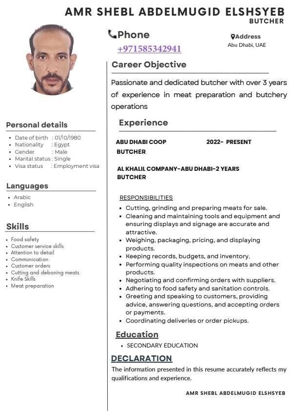 أنا عمرو من مصر جزار متواجد في مدينة أبوظبي التأشيرة زيارة ومع العلم لدى الخبرة الكافيه داخل دولة الامارات أربعة سنوات