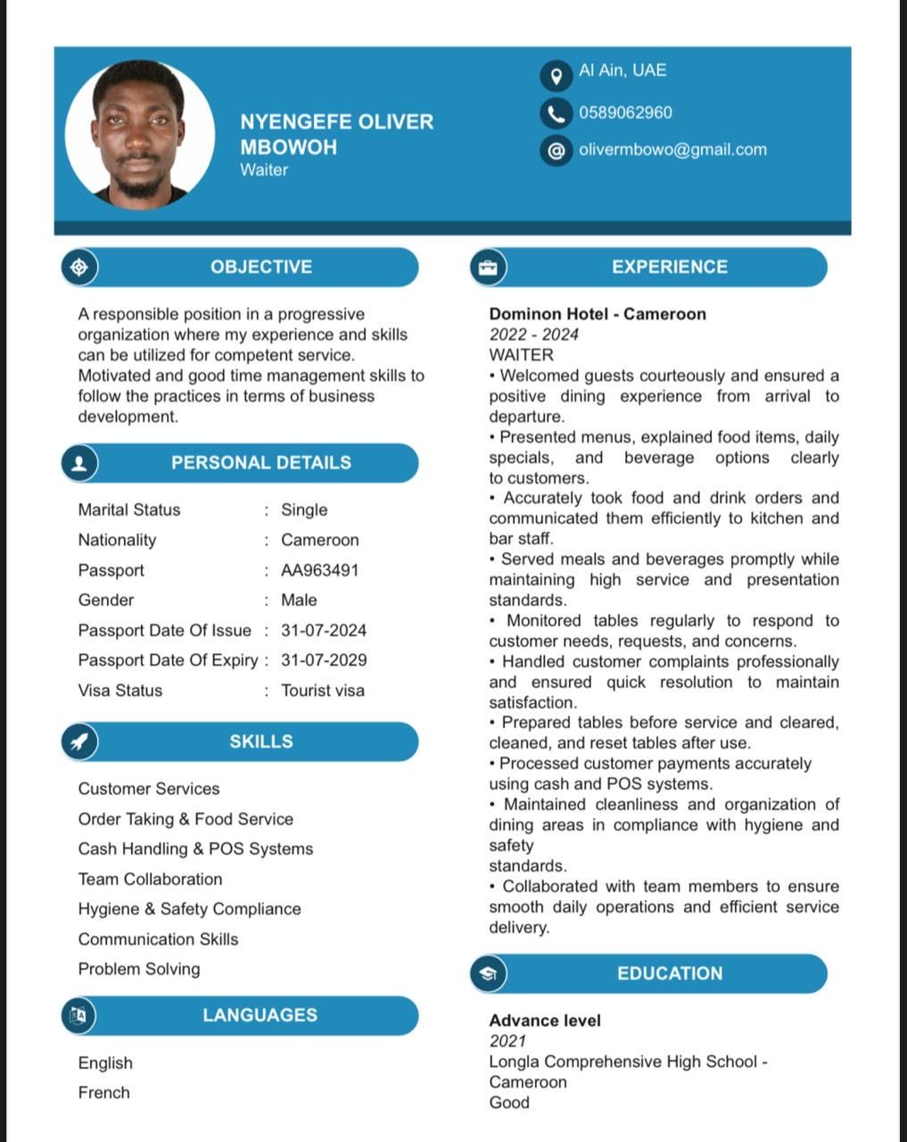 An experienced waiter with over 5 years experience and coffee knowledge. Ready to join immediately