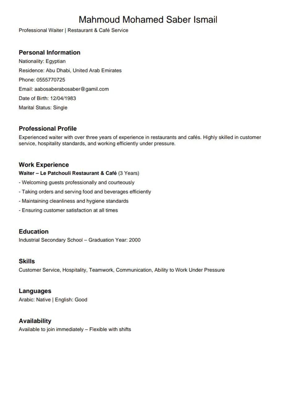 نادل خبرة ثلاث سنوات في مطعم وكافية لي باتشولى