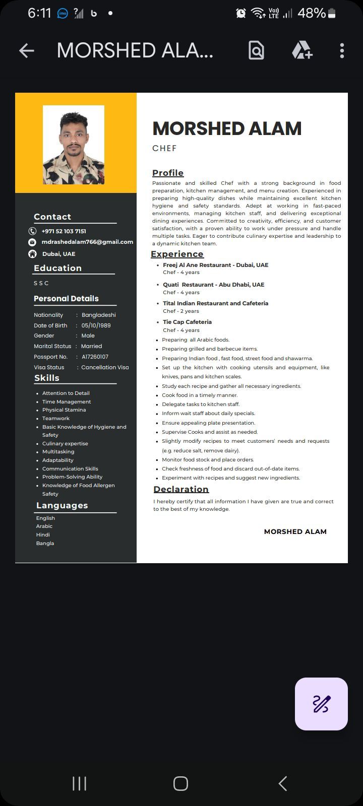 I am restaurant cheif and cook 14 years experience look at the job