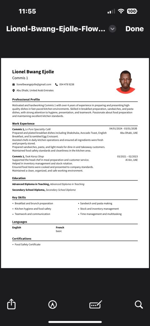 I am a professional chef with over 20 years of extensive experience in cooking, specializing in grills, appetizers, manakeesh, pizza, and a variety of dishes. I am seeking a serious job opportunity in a restaurant, villa, or with a family in Dubai or any other emirate. Skills and Experience Extensive experience in kitchen management and preparing high - quality dishes Commitment to cleanlin