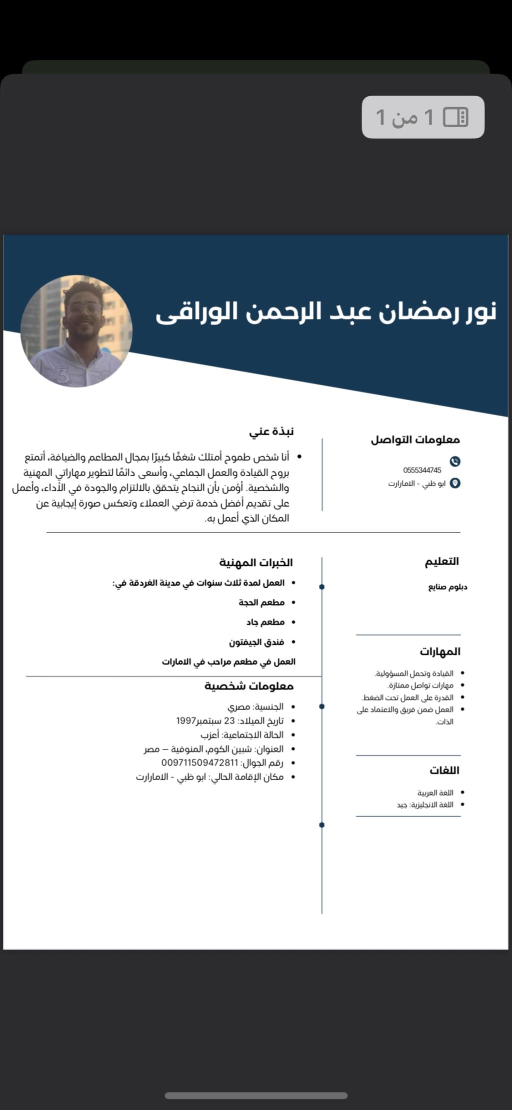 نور مصري، ابحث عن عمل وايتر مساعد شيف استيوار موجود إقامة ولا مانع موجود في أبو ظبي