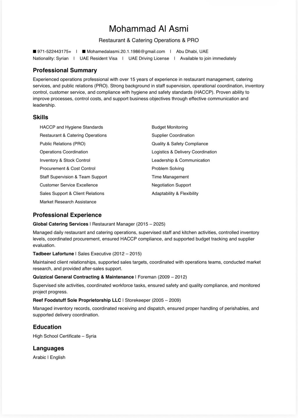 Job Seeker - Restaurant/ Catering/ Operations/ PRO 15 + years UAE experience in restaurant & catering operations. Skilled in staff supervision, daily operations, inventory & cost control, and HACCP compliance. Seeking Restaurant Manager, Operations Supervisor, PRO, Foreman, or Storekeeper. Abu Dhabi, valid visa, driving license, available immediately