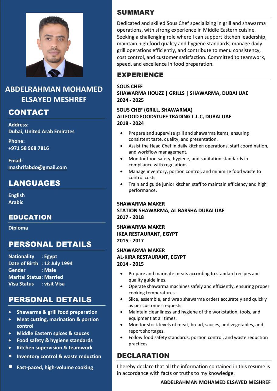 معلم شاورما ومشاوي ابحث عن عمل داخل الامارات فيزا زيارة ممكن اعمل إقامة حره مع وجود العمل المناسب. خبرة 10 سنين في الامارات