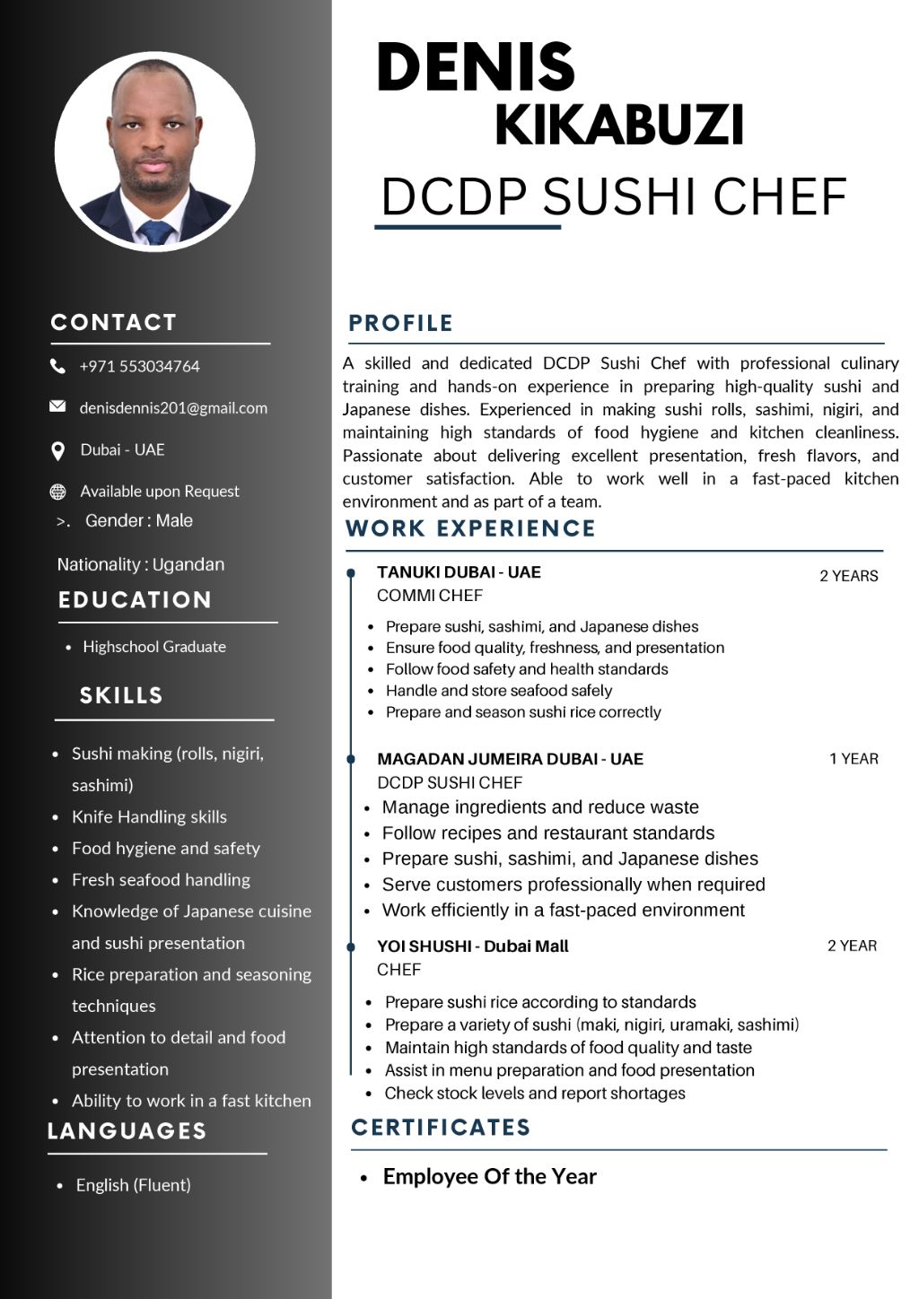 I am an experienced Demi Chef de Partie (DCDP) Sushi Chef currently seeking a new opportunity in the UAE. I am on cancellation and available to join immediately, with strong experience working in high - volume Japanese restaurants. I recently worked as a DCDP Sushi Chef at MAGADAN Dubai for 1 year, previously as a Sushi Chef at Yoi Sushi Dubai for 2 years, and as a Commis Chef at Tanuki Dubai for 2 years