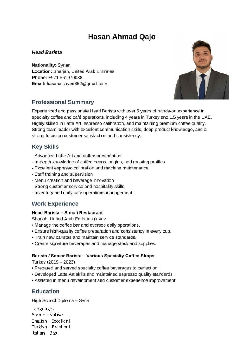 Head barista with 2 years of experience in the UAE and 5 years in Trkiye serch for job. Extensive experience in all types of specialty coffee, machine calibration, and team management and organization