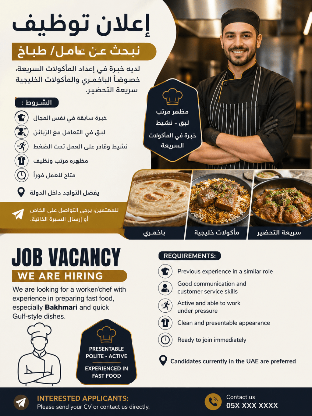 نبحث عن عامل / طباخ لديه خبرة في اعداد المأكولات السريعة، خصوصا ألبا خمري والمأكولات الخليجية سريعة التحضير