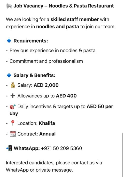We are looking for an employee for a temporary position in Alraha Abu Dhabi. Requirements Experience in preparing pizza and salads - Good command of the English language - Preferably holding a valid residence visa - Ability to work as part of a team and handle work pressure Work location Alraha Abu Dhabi, Employment duration Temporary Contact WhatsApp only