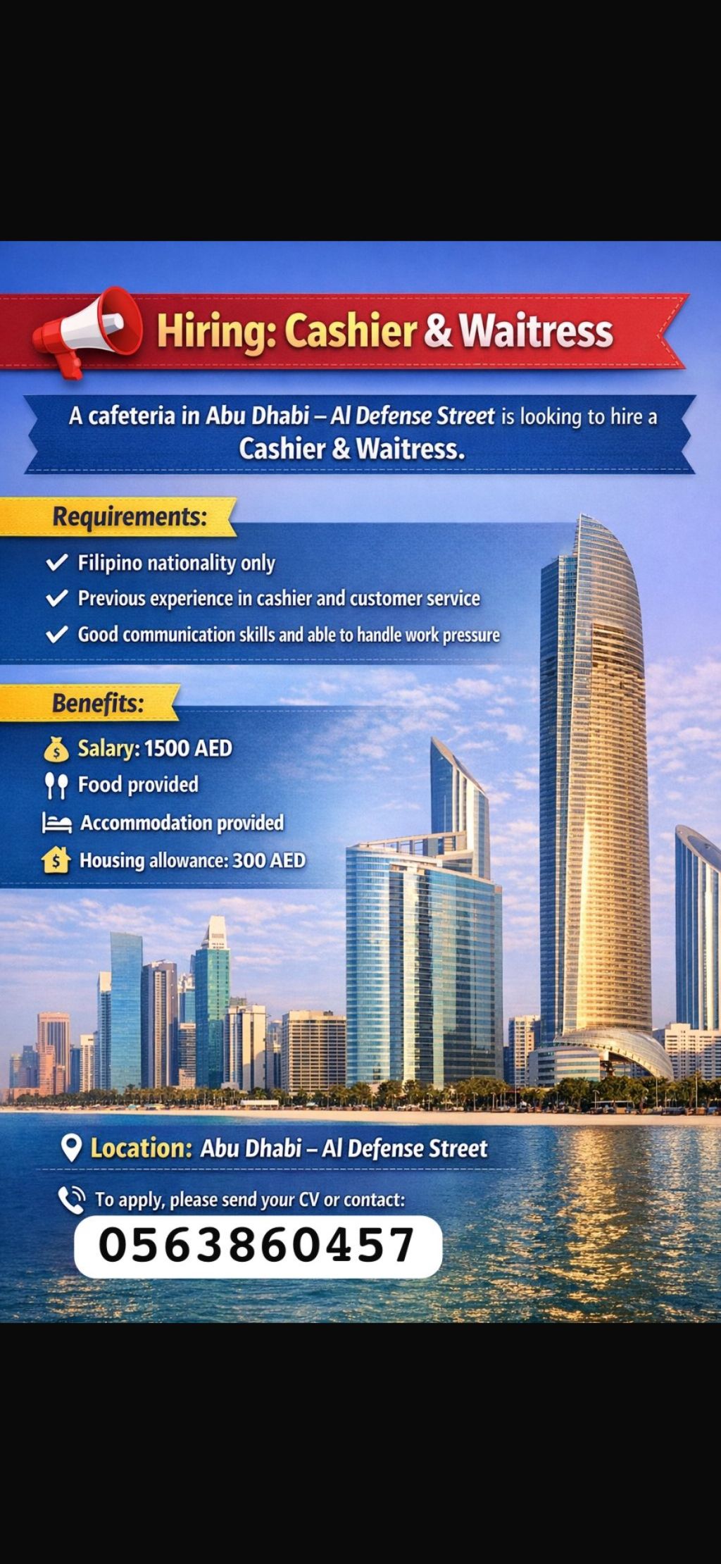 Cashier & Waitress. Requirements Filipino nationality only - Previous experience in cashier and customer service - Good communication skills and able to handle work pressure Benefits Salary AED1500 - Food provided - Accommodation provided - Housing allowance AED300 Location Abu Dhabi - Al Defense Street
