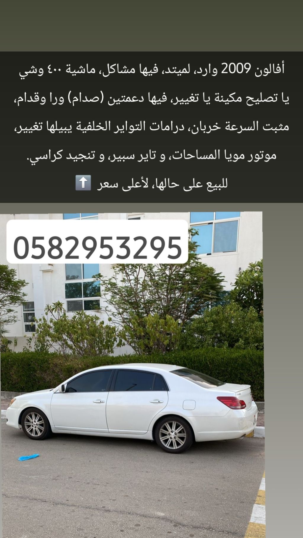 تويوتا أفالون 2009 وارد، نسخة محدودة، بها مشاكل، مسافة 402,000 كم. تحتاج إما إلى تصليح المكينة أو تغييرها. بها تلف في الصدام الأمامي والخلفي. مثبت السرعة معطل. درامات العجلات الخلفية تحتاج إلى تغيير. موتور مياه المساحات، وإطار احتياطي، وتنجيد المقاعد متضمنة. للبيع كما هي، لأعلى سعر.