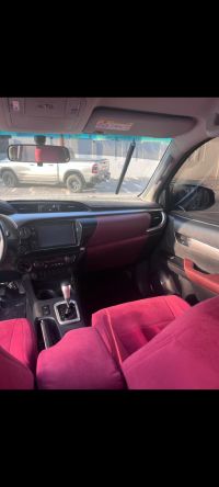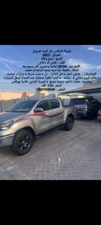 تويوتا هايلوكس دبل كابينة دفع رباعي، موديل 2023. الصبغ وكالة، اللون فضي أو دخاني. المسافة المقطوعة: 28,700 كم. الحالة: شبه جديد، استخدام شخصي. المواصفات: طبلون أحمر + ناقل حركة أوتوماتيك + دفع رباعي + مثبت سرعة + مرايا أوتوماتيكية + جنوط كروم دخانية + شاشة + كاميرا خلفية + حماية ضد الصدأ أسفل السيارة (زيبارت) + حماية أرضية داخلية (مشمع) + تلبيسة كراسي خاصة بالهايلوكس. السعر: 110,000 درهم إماراتي.