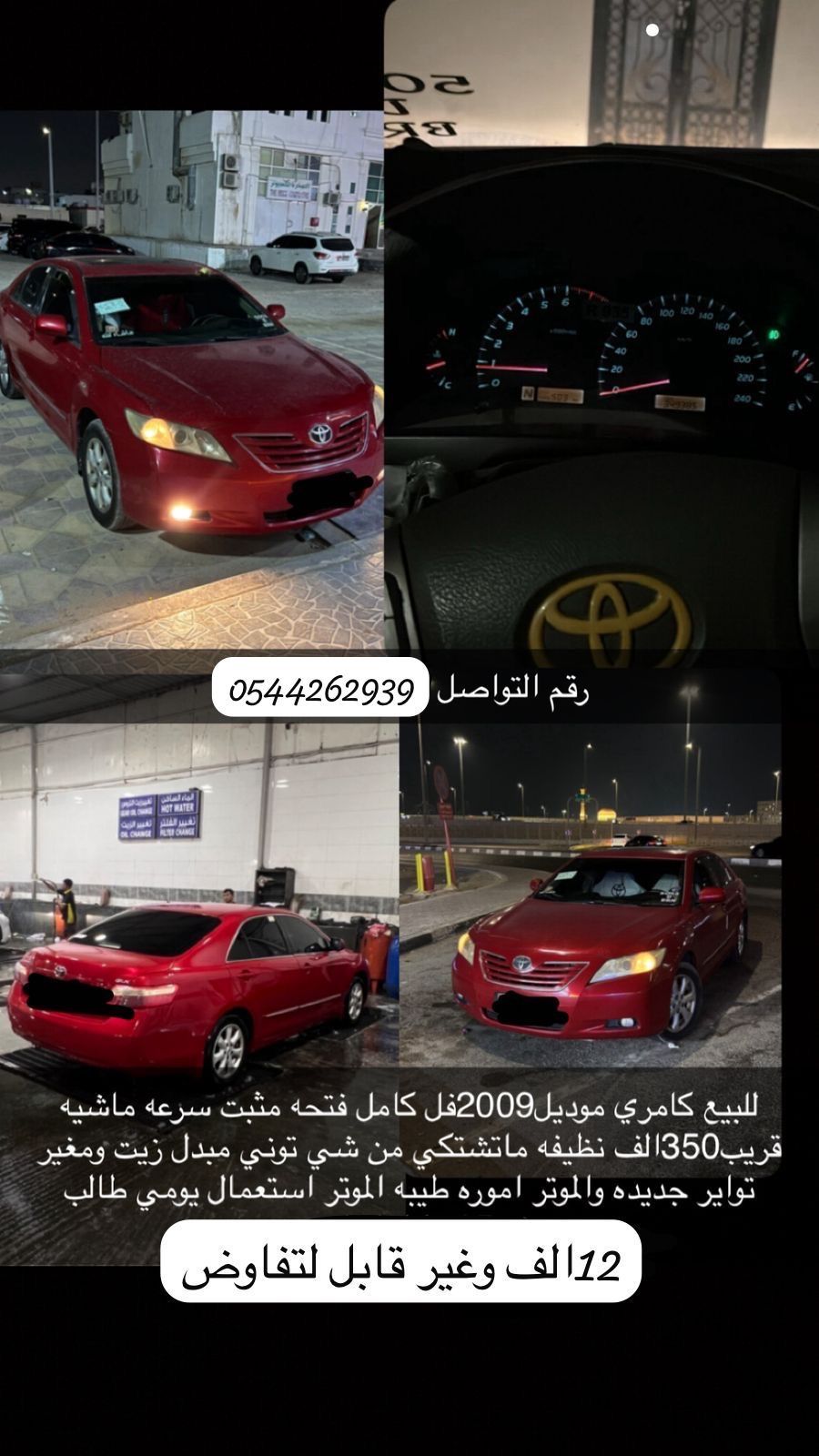 للبيع: تويوتا كامري موديل 2009، فل كامل مع فتحة سقف ومثبت سرعة. الممشى حوالي 350,000 كم. السيارة نظيفة ولا تشتكي من أي شيء. تم تغيير الزيت مؤخراً وتركيب إطارات جديدة. المحرك بحالة جيدة، مستعملة للقيادة اليومية. السعر المطلوب 12,000 درهم، غير قابل للتفاوض. للجادين فقط. البيع مستعجل.