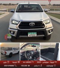 For sale: Toyota Hilux 2025 model with 68,000 km mileage. Original factory paint, engine is clean and well-maintained. Price: AED 105,000 (negotiable). Contact by phone only, please respect the time.