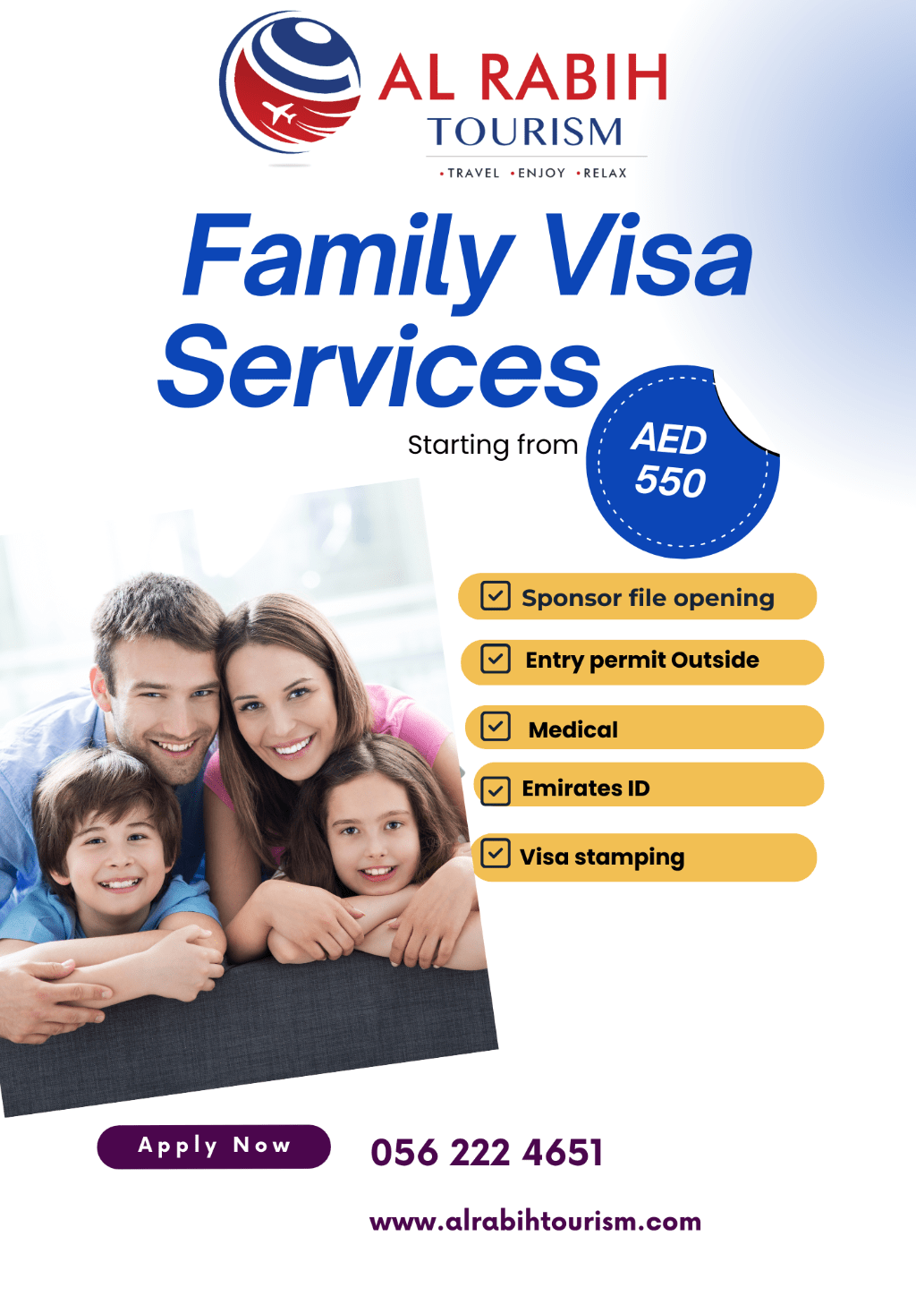 تقدم بطلب تأشيرة عائلية مع شركة الرابح للسياحة بكل سهولة. نقدم تأشيرة عائلية لمدة عامين بسعر مميز جدا. 650 درهم لملف الكفيل وتصريح الدخول. الفحص الطبي، وبطاقة الهوية الاماراتية، وختم التأشيرة بعد الدخول 1200 درهم، وللاطفال 1300 درهما اماراتيا، ومدة معالجة التأشيرة من يوم الى يومين عمل