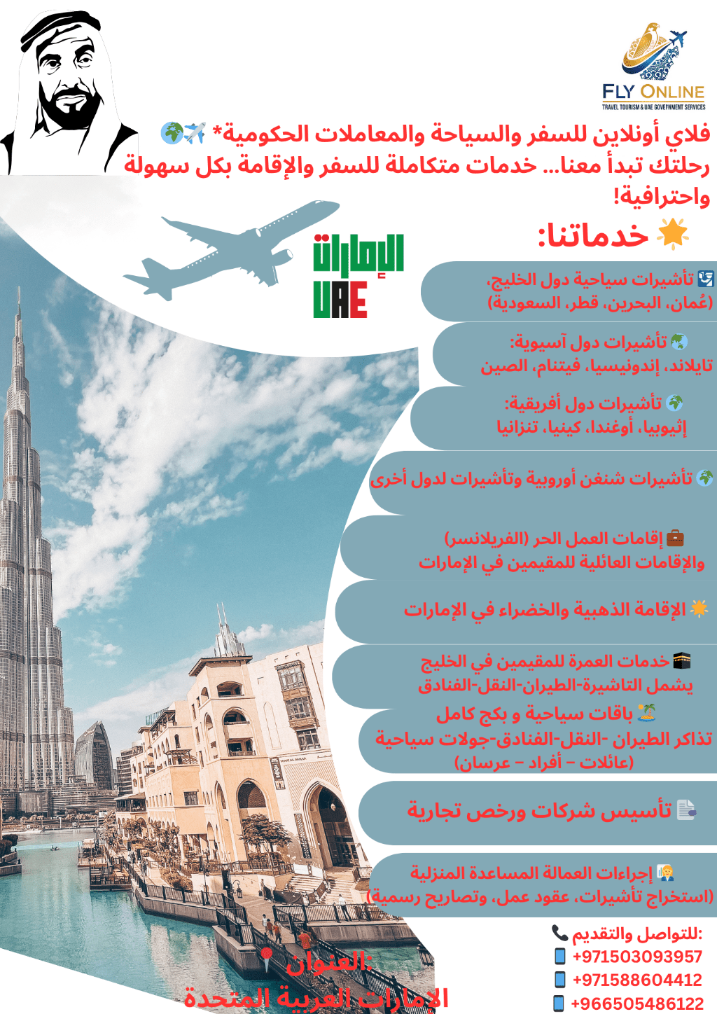 فلاي اونلاين للسفر والسياحة والمعاملات الحكومية لأن رحلة عملائنا تبدأ معنا نبحث دائما عن شركاء نجاح في مجال السفر والسياحة والخدمات المتكاملة. فلاي اونلاين للسفر والسياحة والمعاملات الحكومية رحلتك تبدأ معنا خدمات متكاملة للسفر والإقامة بكل سهولة واحترافية خدماتنا تأشيرات سياحية للامارات، دول الخليج، وأفريقيا (عمان، البحرين، قطر، السعودية) تأشيرات دول آسيوية تايلاند، أندونيسيا، فيتنام، الصين