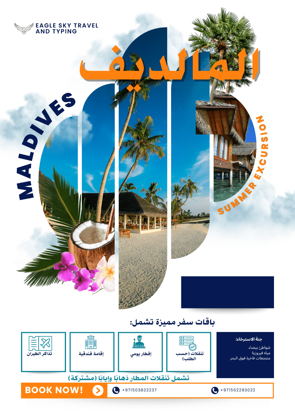 المالديف جزر خلابة وشواطئ بيضاء مياه فير وزية صافية منتجعات فاخرة فوق البحر باقات سفر مميزة تشمل تذاكر الطيران إقامة فندقية افطار يومي تنقلات من والى المطار (حسب الطلب) مثالية لشهر العسل والاستجمام احجز الآن واستمتع بتجربة لا تنسى في المالديف