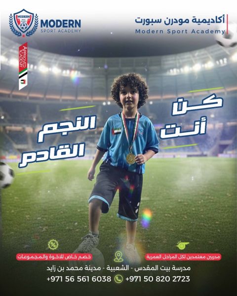 أكاديمية مودرن سبورت لتعليم وتدريب كرة القدم في مدينة محمد بن زايد في مدرسة بيت المقدس الدولية الخاصة من عمر 4 سنوات حتى 14 سنة مع مدربين معتمدين ومؤهلين وبرامج تدريبية حديثة للفئات العمرية المختلفة هدفنا تعليم - تدريب - تطوير مستوى. اشترك الآن وكن أنت النجم القادم
