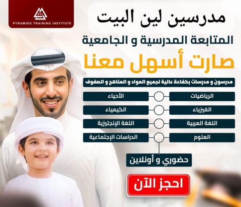 معهد pyramids training institute يقدم أسعار حصرية. لخدمة مدرسين لين البيت لدورات المتابعة المدرسية دورات التأسيس كل الصفوف والمناهج الدراسية معلمين مختصين كل أنحاء الامارات. وليس فقط في العين أسعار حصرية لتسجيل أكثر من طالب. أسعار حصرية للدورات الحضوري كانت أو online أو مدرسين لين البيت (دورات تأسيس وتقوية اللغات لكل لغات العالم) للتواصل والتفاصيل