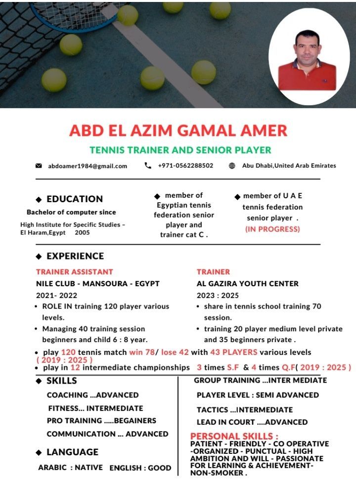 مدرب تنس مبتدئين - اطفال من 5 12. سنة - شريك لعب لأي لاعب مستوى متوسط فيما فوق - جاهز للعمل كمساعد في مستويات متقدمة