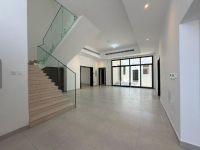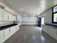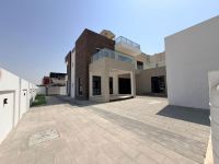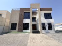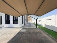 Villa for rent in Masdar City, consisting of 6 master bedrooms, 2 large living rooms, a kitchen, a maid's room, a laundry room, a large garden, and a shaded parking area. Price 350000 dirhams