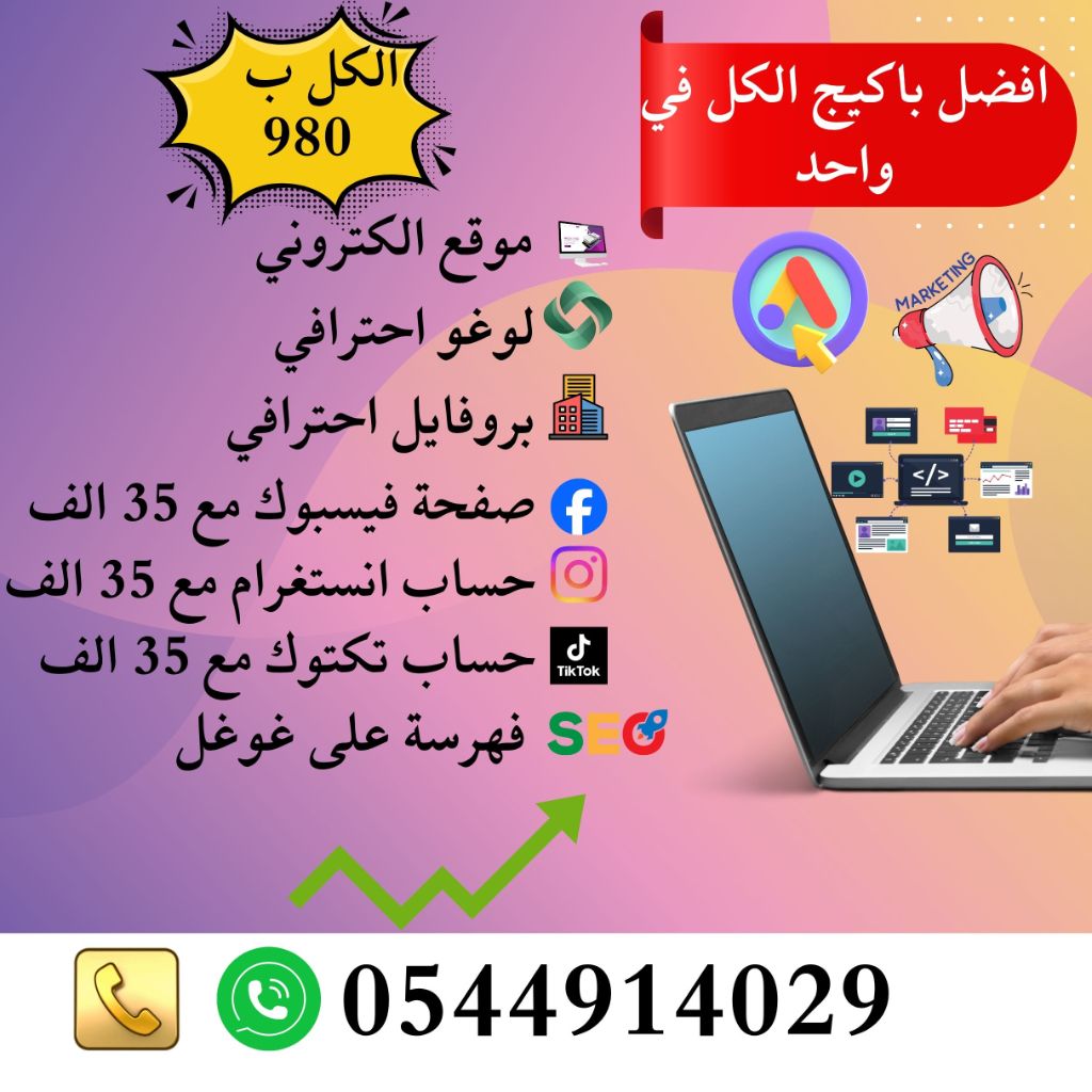 أفضل عرض في الامارات الكل في واحد. تصميم موقع الكتروني احترافي يدعم عدة لغات + لوغو احترافي + بروفايل احترافي + حساب انستغرام 35 ألف متابع + حساب فيسبوك مع 35 ألف متابع + حساب تكتوك مع 35 ألف متابع + فهرسة على غوغل. الكل فقط ب 980 درهم