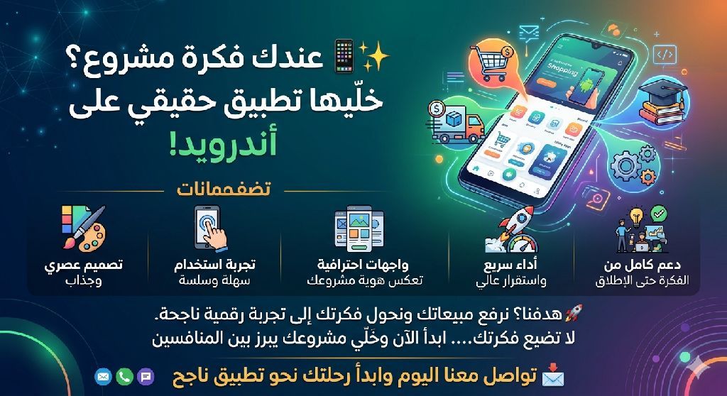 عندك فكرة مشروع خليها تطبيق حقيقي على اندرويد نقدم لك تصميم وتطوير تطبيقات اندرويد باحترافية عالية تناسب جميع أنواع المشاريع من المتاجر الالكترونية الى التطبيقات الخدمية والتعليمية ماذا نضمن لك - تصميم عصري وجذاب يخطف الانتباه - تجربة استخدام سهلة وسلسة تناسب جميع الفئات - واجهات احترافية تعكس هوية مشروعك - أداء سريع واستقرار عالي - دعم كامل من الفكرة حتى الاطلاق هدفنا نرفع مبيع