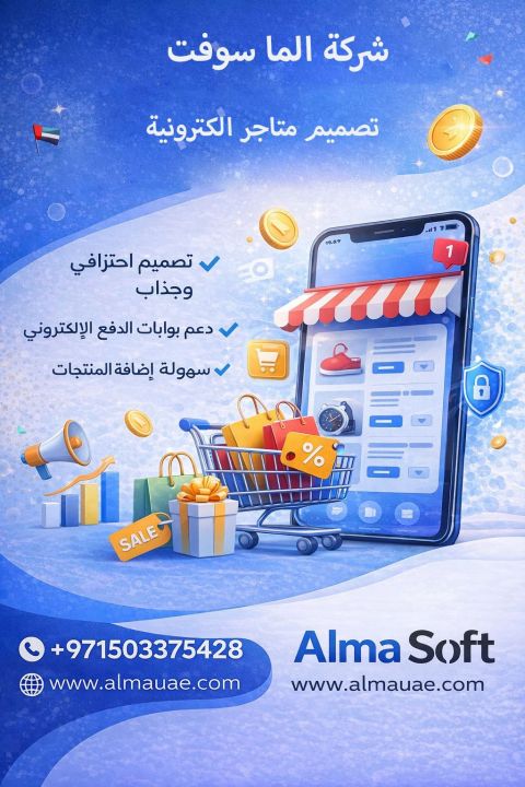 أطلق متجرك الالكتروني مع AlmaSoft هل ترغب بزيادة مبيعاتك والوصول لعملائك بسهولة نحن في AlmaSoft نصمم لك متجرا الكتروانيا احترافيا يساعدك على البيع بثقة والنجاح اونلاين. تصميم عصري وجذاب دعم بوابات الدفع الالكتروني سهولة اضافة وإدارة المنتجات متوافق مع الجوال وجميع الاجهزة ابدأ تجارتك الالكترونية اليوم ودعنا نحول فكرتك الى متجر ناجح للتواصل