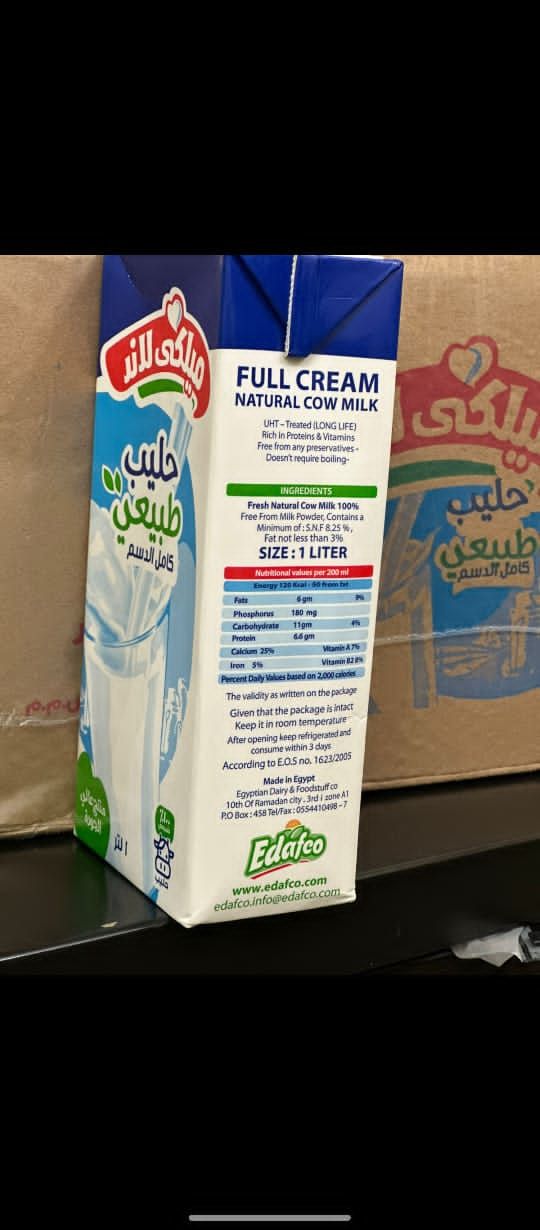 للبيع حليب كامل الدسم طبيعي 100% حليب بقري كامل الدسم، معالج UHT طويل الأمد ولا يحتاج غلي مناسب للبقالات، المطاعم، والكافتيريات العبوة 12*1 لتر الكمية 500 كرتون تباع كاملة فقط تاريخ الانتاج 21082025 تاريخ الانتهاء 20052026 السعر النهائي 33 درهم للكرتون الدفع كاش