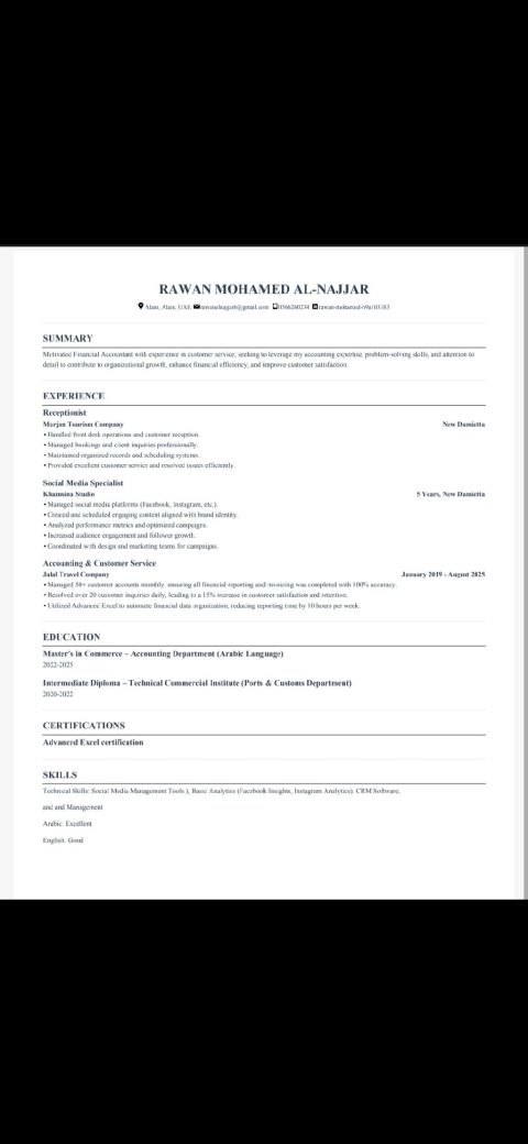 روان محمد النجار 25 سنة، مصرية معي مؤهل بكالوريوس تجارة قسم محاسبه، متواجده في العين، ابحث عن فرصة عمل