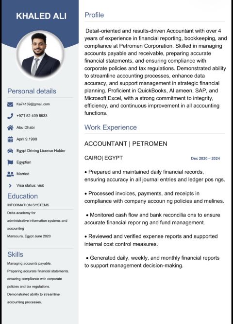 محاسب مصري الجنسية 26 عام. حاصل على بكالوريوس تجارة قسم محاسه اعمل على جميع برامج مايكروسوفت وكويك بوكس وأجيد تقديم التقارير الضريبيه ومتابعه التسويات البنكية ومتابع حسابات الفيزا وجميع طرق الدفع لدى سنتين خبرة داخل الامارات وابحث عن فرصة عمل