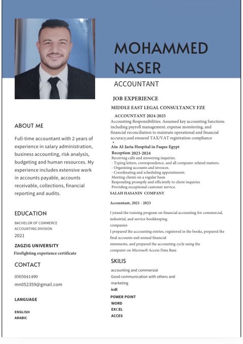 محاسب - محمد أحمد عبدالله محاسب خبرة 5 سنوات في السعودية والامارات، متمكن من إدارة الحسابات اليومية والتقارير المالية. أجيد استخدام Microsoft Office وبرامج ERP. ابحث عن فرصة عمل تناسب خبرتي في بيئة احترافية تسهم في التطوير والنمو. متاح للانضمام فورا التواصل على الأرقام السابقه تواصل