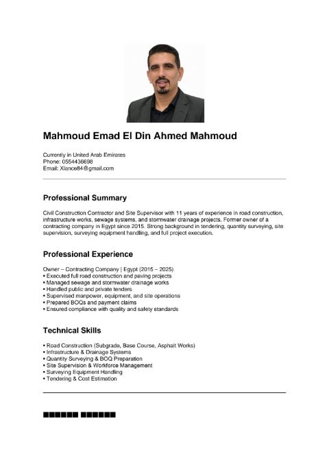 أنا مراقب أعمال طرق وبنية تحتية وأعمال متكامله وأعمال صرف صحي وعندي خبرة في مجال 11 عام وعمل المستخلصات ومتابعة الأعمال وعمل جداول الكميات ومتابعة سير العمل والالتزام بالجدول الزمني وازالة أي معوقات وعندي القدرة مراقبه أكثر من موقع والحفظ التلقائي للعمل السابق والجاري تنفيذه التواصل واتساب أو على الايميل
