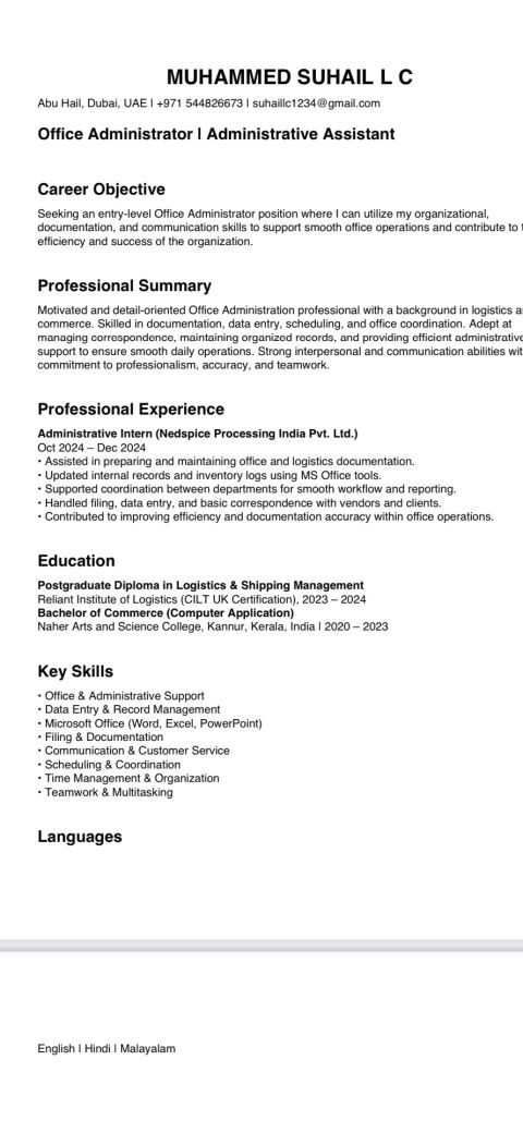 محترف متحمس في مجال الخدمات اللوجستية والإدارة، حاصل على دبلوم في إدارة الشحن واللوجستيات وبكالوريوس في التجارة (تطبيقات الحاسوب) ماهر في تنسيق العمليات اللوجستية، وإدارة المكاتب، وادخال البيانات بدقة. يمتلك مهارات قوية في برامج مايكروسوفت أوفيس واعداد الوثائق ودعم الفريق. يبحث عن فرص عمل في مجالات اللوجستيات أو الإدارة أو ادخال البيانات داخل دولة الامارات