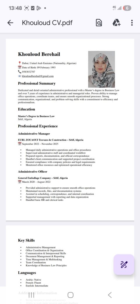 أنا بنت جزائرية، عندي شهادة جامعية، وعم بدور على شغل مناسب، محترم ومستقر. عندي خبرة 4 سنوات كمديرة ادارية في شركة مقاولات، وعندي القدرة أتحمل المسؤولية واشتغل بجدية. اذا في فرصة مناسبة، بتشرف أكون جزء من فريقكم. I am an algerian lady looking for a respectful and suitable job