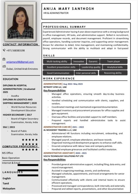 I am Anija Mary Santhosh, an experienced Administrator with over 3 years of service in the UAE. I specialize in scheduling, client/ vendor communication, and efficient use of MS Office and Outlook. I am currently looking for new job opportunities. You can reach me at