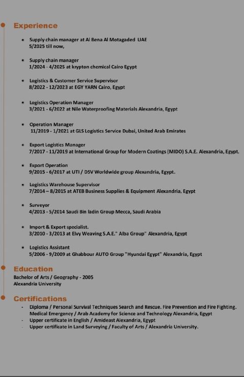 Experience more than 15 y as a Supply chain, Logistics, Import & Export Operation/ UAE Driving License, Valid UAE residence