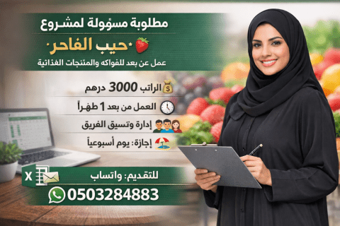 مطلوبة مسؤولة لمشروع منزلي (عمل عن بعد) نبحث عن مسؤولة مشروع ذات شخصية قيادية، تمسك إدارة مشروعنا في مجال الفواكه والمنتجات الغذائية، وتكون همزة الوصل بين الإدارة والفريق. مميزات الوظيفة الراتب 3000 درهم شهريا ساعات العمل من 8 الى 10 ساعات يوميا (حسب الضغط) فترة العمل الأساسية من بعد الساعة 1 ظهرا وحتى المساء العمل عن بعد بالكامل إجازة يوم واحد أسبوعيا المهام العامة متابعة سير العمل اليومي والتأكد
