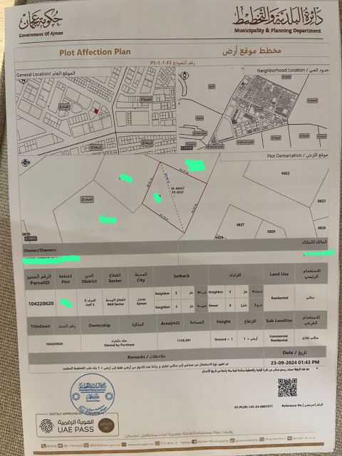 للبيع أرض سكني تجاري صناعي في عجمان المنامة موقع بارز المساحة 787543.84 قدم 73164.61 متر مربع 50 قسيمة السكني تجاري 241833.49 قدم الصناعي 545710 قدم مفروزة الى عدة قسائم تملك جميع الجنسيات تباع بشرط جميع الأراضي السعر 52 مليون